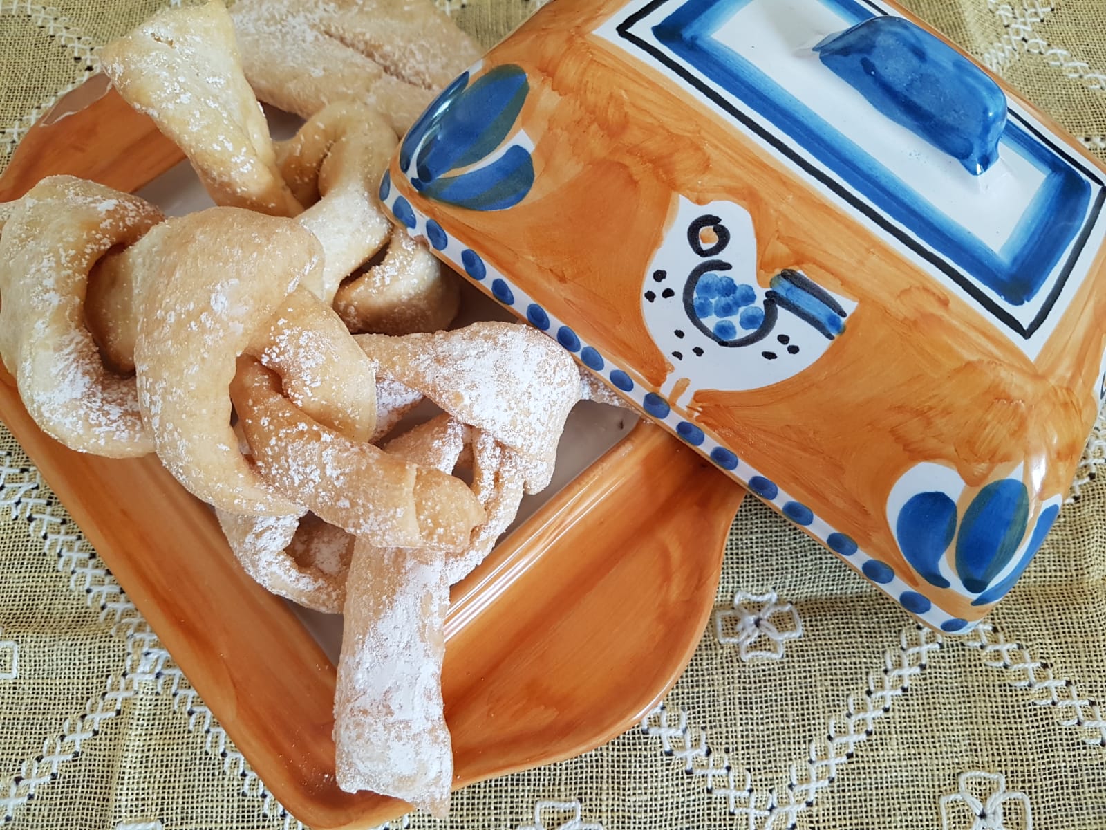 Le chiacchiere sono sfoglie fritte croccanti, delicate e friabili, piene di bolle. Tipiche del periodo di Carnevale, sono chiamate con nomi diversi a seconda delle regioni di provenienza: frappe, crostoli, bugie, frittole, frappe, strufoli, fiocchetti et cetera. La base è un impasto di farina, burro, zucchero ed uova cui aggiunge una componente alcolica: distillati, liquori o vini tipo marsala, sambuca, acquavite, grappa o vinsanto. Successivamente l’impasto viene tagliato obliquamente, a strisce rettangolari regolari corte o a strisce lunghe con cui poi si formano dei nodi o fiocchetti.